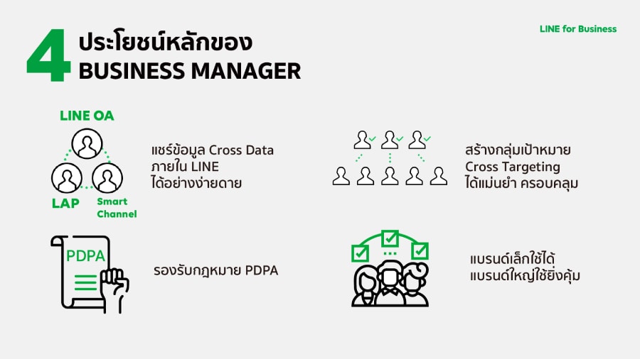 BUSINESS MANAGER คือ ดาต้าโซลูชั่นใหม่ล่าสุดจาก LINE ที่เป็นตัวกลางในการจัดการข้อมูลที่เกิดขึ้นภายใน LINE Ecosystem จาก 3 ช่องทางคือ LINE Official Account (LINE OA), LINE Ads Platform (LAP) และ LINE Smart Channel เพื่อนำมาวิเคราะห์ จำแนก สร้างกลุ่มเป้าหมายสำหรับการสื่อสาร และการตลาดได้อย่างมีประสิทธิภาพ ทำให้แบรนด์สามารถใช้ 3 ช่องทางดังกล่าวให้เกิดประโยชน์สูงสุด ด้วย 4 ประโยชน์หลัก ดังนี้
