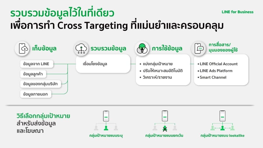 โดยแบรนด์สามารถ Retarget ยิงข้อความ ยิงโฆษณากลับไปผ่านช่องทางใดก็ได้ใน 3 ช่องทางที่ต้องการ ในรูปแบบ Cross Targeting ไม่ว่าจะเป็น นำกลุ่มลูกค้าที่มีพฤติกรรมการคลิกโฆษณาจาก LAP มาเป็นกลุ่มเป้าหมายในการยิงข้อความผ่าน LINE OA หรือนำเอากลุ่มลูกค้าที่มีพฤติกรรมการคลิกสินค้าบน LINE OA มาเป็นกลุ่มเป้าหมายในการยิงโฆษณาผ่าน LAP หรือ LINE Smart Channel เป็นต้น ทั้งนี้ แบรนด์สามารถเลือกวิธีการส่งข้อความหรือยิงโฆษณาให้ระบุเป็นกลุ่มเป้าหมาย ยกเว้นกลุ่มดังกล่าวออกไป หรือนำกลุ่มดังกล่าว มาหากลุ่มเป้าหมายแบบ Look Alike เพิ่มได้เช่นกัน