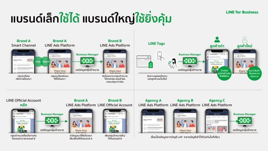 ทำให้แบรนด์สามารถนำข้อมูลจาก LINE OA หลักมาใช้ยิงโฆษณาให้กับ LINE OA ของสาขาได้ อาทิ การเพิ่มเพื่อน (Gain Friends) ระหว่าง LINE OA หลัก และ LINE OA สาขา หรือใช้ข้อมูลที่ได้จาก LINE Tag มาสร้างแคมเปญโฆษณาที่หลากหลาย อาทิ ยิงโฆษณาลดราคาให้กับลูกค้าประจำ พร้อมยิงโฆษณาโปรโมทสินค้าให้กับลูกค้าใหม่ เป็นต้น ซึ่งการแลกเปลี่ยนข้อมูล Cross Platform ภายใต้ LINE Ecosystem เช่นนี้ จะทำให้การทำการตลาดบน LINE มีความหลากหลาย และเพิ่มประสิทธิภาพ สร้างโอกาสความสำเร็จเป็นเท่าทวีคูณ