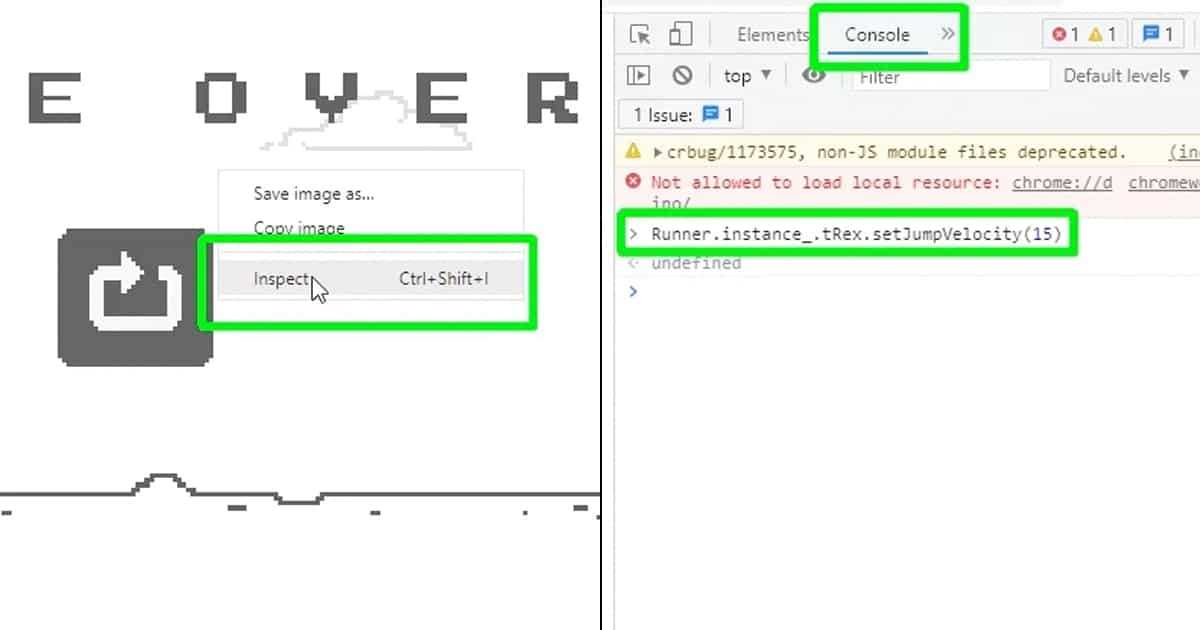 - หากต้องการปรับความสูงของการกระโดด ให้พิมพ์หรือคัดลอกรหัส Runner.instance_.tRex.setJumpVelocity(15) ลงในกล่องข้อความ Console text box แล้วกด Enter ผู้เล่นสามารถเปลี่ยนจากเลข 15 เป็นเลขที่สูงขึ้นหรือต่ำลงก็ได้ เพื่อเพิ่ม/ลดระดับความสูงของการกระโดดของ T-Rex