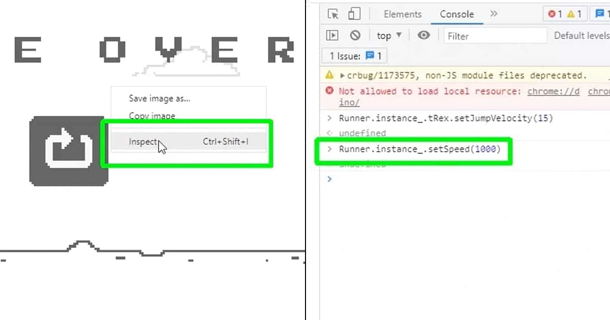 - หากต้องการปรับความเร็วการวิ่งของไดโนเสาร์ ให้พิมพ์หรือคัดลอกรหัส Runner.instance_.setSpeed(1000) ลงในกล่องข้อความ Console text box แล้วกด Enter ผู้เล่นสามารถเปลี่ยนจากเลข 1000 เป็นเลขที่สูงขึ้นหรือต่ำลงก็ได้ เพื่อเพิ่ม/ลดความเร็วการวิ่งของ T-Rex