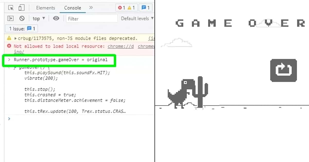 4. หากการเป็นอมตะทำให้ผู้เล่นเริ่มเบื่อและหมดความท้าทาย สามารถเปลี่ยนกลับมาเล่นเกมแบบปกติได้โดย เข้าไปที่ Developer tools จากนั้นพิมพ์หรือคัดลอกรหัส Runner.prototype.gameOver = original ลงในกล่องข้อความแล้วกด Enter จากนั้น เจ้าไดโนเสาร์ T-Rex จะสามารถตายได้แบบเกมปกติ
