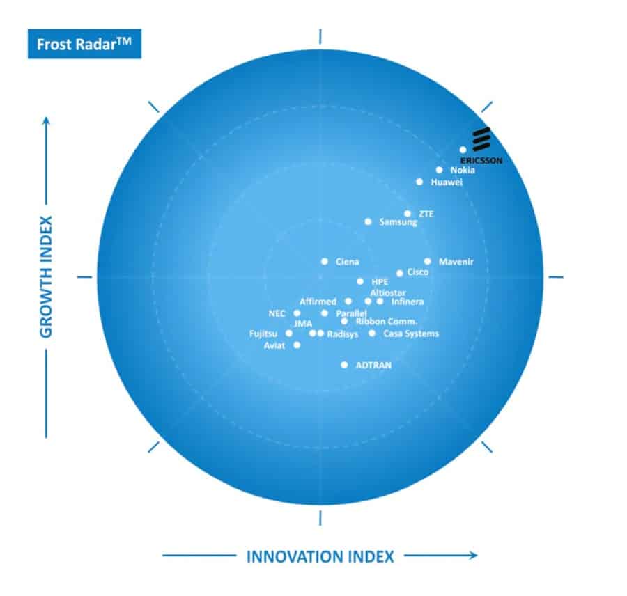 การได้รับจัดอันดับสูงสุดใน Frost Radar™ ของ Frost & Sullivan บริษัทผู้ให้คำปรึกษาทางธุรกิจชั้นนำ เผยให้เห็นว่าอีริคสันคือผู้นำอย่างแท้จริงในตลาดโครงสร้างพื้นฐานเครือข่าย 5G ทั้งในด้านการพัฒนานวัตกรรมและในด้านการเติบโต ที่ครอบคลุมไปถึง 5G Radio Access Networks (RAN), Transport Networks และ Core Networks