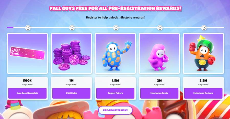 ผู้เล่นใหม่สามารถเข้าไปลงทะเบียนสำหรับตัวเกมฟรีที่กำลังจะอัปเดตได้ที่ Fall Guys Free For All Pre-Registration เพื่อรับของรางวัลภายในเกม (หากยอดลงทะเบียนทะลุตามเป้าหมายที่ทางตัวเกมกำหนดไว้)