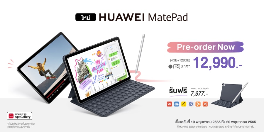 HUAWEI MatePad 10.4-inch 2022 (4GB+128GB) 4G จะวางจำหน่ายในสี Matte Grey ราคา 12,990 บาท โดยพรีออเดอร์ได้ตั้งแต่วันที่ 10 พฤษภาคม 2565 – 20 พฤษภาคม 2565 รับทันที HUAWEI Smart Keyboard (มูลค่า 2,290 บาท) และ HUAWEI M-Pencil Package 2nd generation (มูลค่า 4,490 บาท) และสิทธิประโยชน์อีกมากมาย สำหรับลูกค้า HUAWEI Mobile Service และแอปพลิเคชันต่างๆ (มูลค่ารวม 1,197 บาท) รวมมูลค่าทั้งหมด 7,977 บาท สามารถสั่งจองได้ผ่านหน้าร้าน HUAWEI Experience Store และร้านค้าตัวแทนจำหน่ายที่ร่วมรายการ รวมถึงช่องทางออนไลน์อย่างเว็บไซต์ HUAWEI Store ร้านค้าอย่างเป็นทางการของหัวเว่ยบนแอปพลิเคชัน Shopee, Lazada, JD Central และ Thisshop และแอปพลิเคชัน My HUAWEI