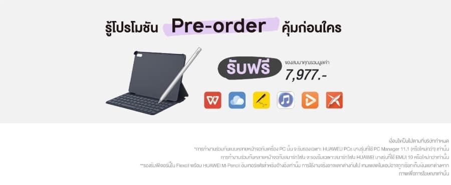 คุ้มก่อนใคร สำหรับใครที่พรีออเดอร์สินค้าตั้งแต่วันที่ 3 พฤษภาคม 2565 – 20 พฤษภาคม 2565 นี้รับทันที HUAWEI Smart Keyboard (มูลค่า 2,290 บาท) และ HUAWEI M-Pencil Package 2nd generation (มูลค่า 4,490 บาท) และสิทธิประโยชน์อีกมากมาย สำหรับลูกค้า HUAWEI Mobile Service และแอปพลิเคชันต่างๆ (มูลค่ารวม 1,197 บาท) รวมมูลค่าทั้งหมด 7,977 บาท