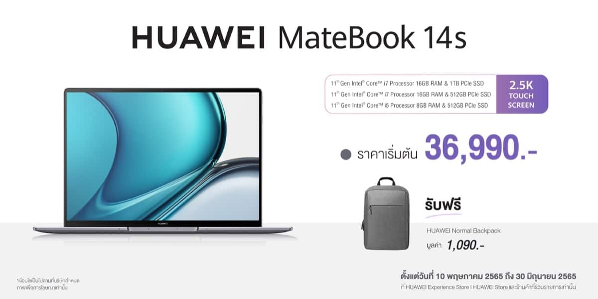 - HUAWEI MateBook 14 11th Gen Intel® Core™ i5 (16GB+512GB) หน้าจอทัชสกรีน สี Space Grey ราคา 34,990 บาท รับฟรีของสมนาคุณพิเศษได้แก่ HUAWEI Normal Backpack และ HUAWEI Premium Mouse รวมมูลค่า 2,580 บาท