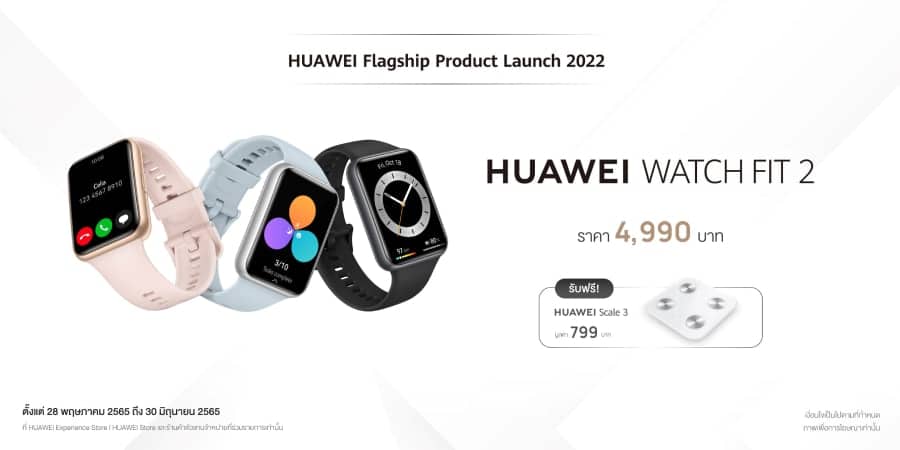 สมาร์ทวอทช์รุ่นขวัญใจมหาชน HUAWEI WATCH FIT 2 สมาร์ทวอทช์ มีให้เลือก 3 สี ได้แก่ สีดำ Midnight Black, สีฟ้า Isle Blue และสีชมพู Sakura Pink ประกาศราคาวางจำหน่ายในประเทศไทยที่4,990 บาท พร้อมโปรโมชันพิเศษเมื่อสั่งซื้อสินค้าก่อนใคร รับฟรี HUAWEI Scale 3 มูลค่า 799 บาท ตั้งแต่ 28 พฤษภาคม 2565 ถึง 30 มิถุนายน 2565 ที่หน้าร้าน HUAWEI Experience Store และร้านค้าที่ร่วมรายการ รวมถึงช่องทางออนไลน์อย่าง HUAWEI Store และร้านค้าอย่างเป็นทางการของหัวเว่ยบน Shopee, Lazada, JD Central และ Thisshop และแอปพลิเคชัน My HUAWEI