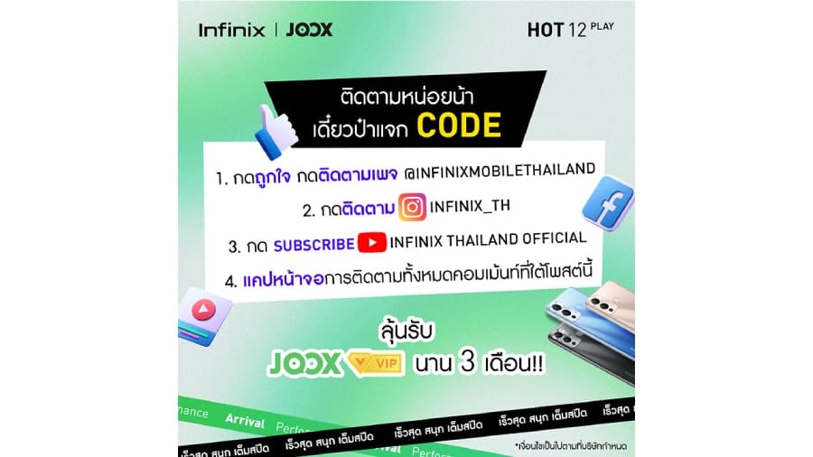 อินฟินิกซ์ (Infinix) แบรนด์สมาร์ตโฟนระดับโลกที่ประสบความสำเร็จและได้รับความนิยมเป็นอย่างมากทั้งในต่างประเทศและประเทศไทย ล่าสุด Infinix HOT 12 จับมือกับ JOOX Thailand แอปพลิเคชันฟังเพลงออนไลน์ที่ได้รับความนิยมมากที่สุดในปัจจุบัน จัดกิจกรรมสุดพิเศษมอบโค้ด VIP 90 วัน หรือนานถึง 3 เดือน ให้สำหรับลูกค้าและผู้ใช้งานทุกคน ที่ให้แฟนๆ ได้ร่วมสนุกลุ้นรับโค้ดเพื่อใช้ฟังเพลงโปรดสุดฮิตบนแอปฯ JOOX พร้อมลุ้นรับของรางวัลสุดเซอร์ไพรส์อีกมากมาย สามารถร่วมสนุกได้ตั้งแต่วันนี้ – 31 พฤษภาคมนี้ เท่านั้น!