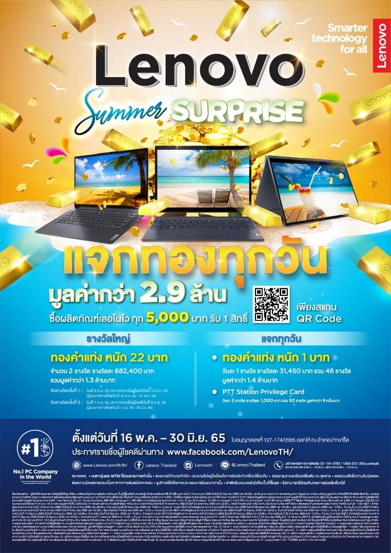 เลอโนโว บริษัทผู้นำด้านคอมพิวเตอร์และสมาร์ทดีไวซ์ระดับโลก นำเสนอเทคโนโลยีเพื่อเสริมประสิทธิภาพทั้งในด้านไลฟ์สไตล์, การทำงาน, และความบันเทิงของผู้คนทั่วโลก จัดเคมเปญ Lenovo Summer Surprise แจกทองคำครั้งใหญ่แห่งปีเพื่อแฟนเลอโนโวทั่วประเทศ เมื่อซื้อผลิตภัณฑ์เลอโนโว โน๊ตบุ๊ค, ออลอินวัน, พีซี, แท็บเล็ต ครบทุก 5,000 บาท ระหว่างวันที่ 16 พ.ค. – 30 มิ.ย. 2565 รับสิทธิในการลุ้นรางวัลทองคำ และอื่น ๆ มูลค่ารวมกว่า 2.9 ล้านบาท โดยยอดซื้อทุก ๆ 5,000 บาท จะได้รับ 1 สิทธิ์ในการลุ้นรับรางวัล* หลังกรอกข้อมูลลงทะเบียนรับสิทธิผ่านทางเว็บไซต์ https://forms.gle/ArhL4M8cRP2X8wBq6 หรือ สแกนคิวอาร์โค้ดตามเอกสารโปรโมชั่นที่ระบุ