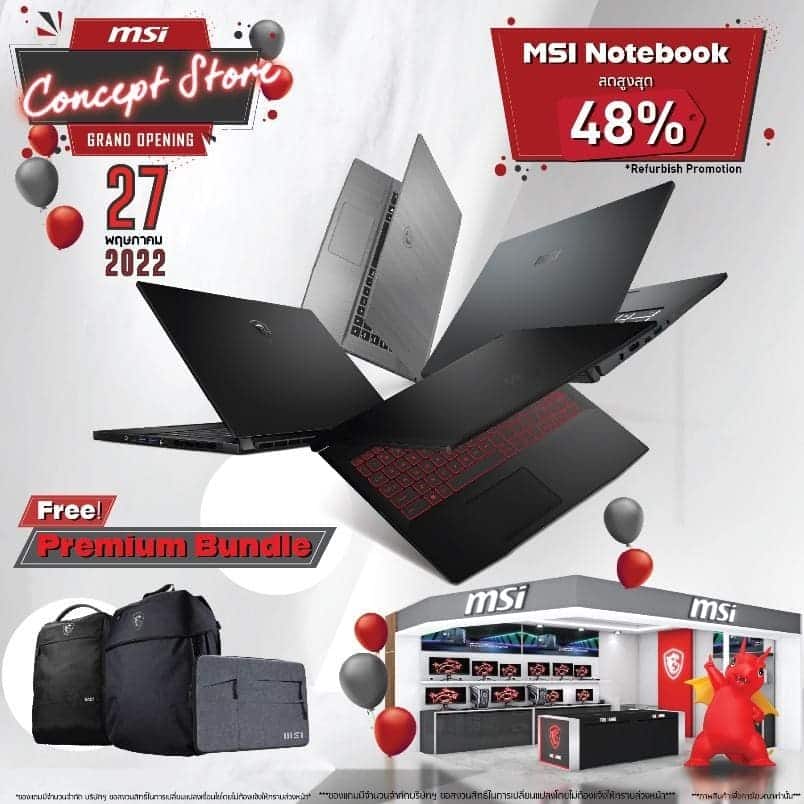 สำหรับโปรโมชั่นโน้ตบุ๊ก MSI ผู้ที่แวะเวียนมาที่ Concept Store จะได้พบกับโน้ตบุ๊กราคาสุดพิเศษ ทั้งโน้ตบุ๊กเกมมิ่งระดับไฮเอนด์ โน้ตบุ๊กเกมมิ่งระดับเริ่มต้น โน้ตบุ๊กสายบางเบา และโน้ตบุ๊กสำหรับครีเอเตอร์มืออาชีพที่มาพร้อมราคาลดสูงสุดถึง 48% โดยโปรโมชั่นนี้จะมีตั้งแต่วันที่ 27 พฤษภาคม 2022 – 10 มิถุนายน 2022