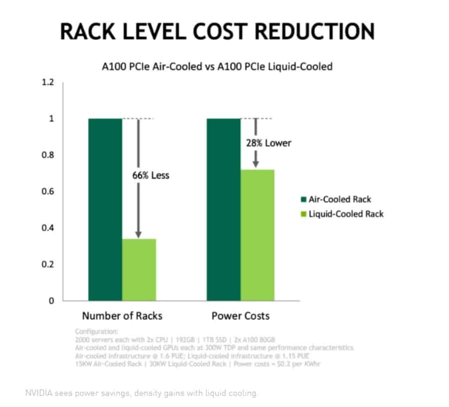 และเพื่อเป็นการตอบสนองต่อความต้องการที่เพิ่มขึ้นของศูนย์ข้อมูล ที่เน้นเรื่องการประหยัดพลังงานและลดผลกระทบต่อสิ่งแวดล้อม ทางเอ็นวิเดียก็ได้ประกาศเปิดตัว GPU A100 PCIe ที่ใช้ระบบระบายความร้อนด้วยของเหลวสําหรับลูกค้าของพวกเขา การระบายความร้อนด้วยของเหลวจะทำให้ GPU มีประสิทธิภาพในการทำงานอยู่ในระดับเดิมแต่ใช้พลังงานน้อยลง