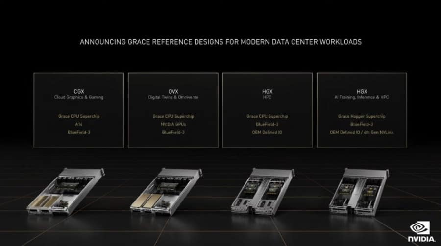 การประกาศที่งาน COMPUTEX 2022 เป็นการแนะนำการออกแบบเซิร์ฟเวอร์อ้างอิงที่ใช้พื้นฐานของ Grace สำหรับผู้ผลิตระบบและซัพพลายเออร์เซิร์ฟเวอร์ มีการออกแบบอ้างอิงใหม่ 4 แบบที่จะรองรับปริมาณงานที่แตกต่างกันของศูนย์ข้อมูลในอนาคต ได้แก่ CGX, OVX, HGX สำหรับซูเปอร์คอมพิวเตอร์ และ HGX สำหรับ AI