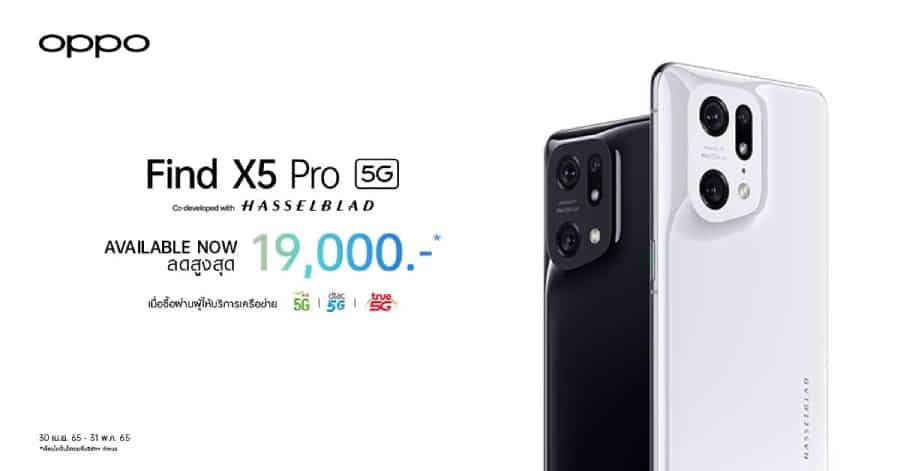 แน่นอนว่าความร่วมมือระดับโลกระหว่างออปโป้ และHasselblad ในการพัฒนาด้านเทคโนโลยีกล้องสำหรับสมาร์ตโฟนแฟลกชิปตระกูล OPPO Find X Series ยังมีให้ได้ติดตามกันต่อเนื่องในอนาคต เพื่อส่งมอบประสบการณ์การถ่ายภาพและวิดีโอที่ดีที่สุดอยู่เสมอ สำหรับผู้ที่สนใจลองไปสัมผัสประสบการณ์การถ่ายภาพระดับตำนานบน OPPO Find X5 Pro 5G โดดเด่นด้วย 4K Ultra Night Video ให้ถ่ายวิดีโอคุณภาพสูงในที่แสงน้อยที่ดีที่สุดแบบที่ไม่เคยมีมาก่อน มาใน 2 สี ได้แก่ สีขาว Ceramic White และสีดำ Glaze Black พร้อมให้เป็นเจ้าของได้แล้ววันนี้ ในราคา 39,990 บาทณ OPPO Brand Shop ทุกสาขา และตัวแทนจำหน่ายทั่วประเทศ และพิเศษเมื่อสั่งซื้อผ่านผู้ให้บริการเครือข่าย AIS, ดีแทค และ ทรูมูฟ เอช ลดสูงสุดถึง 19,000 บาท ตั้งแต่วันนี้ถึง 31 พฤษภาคม 2565