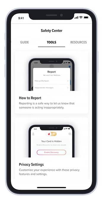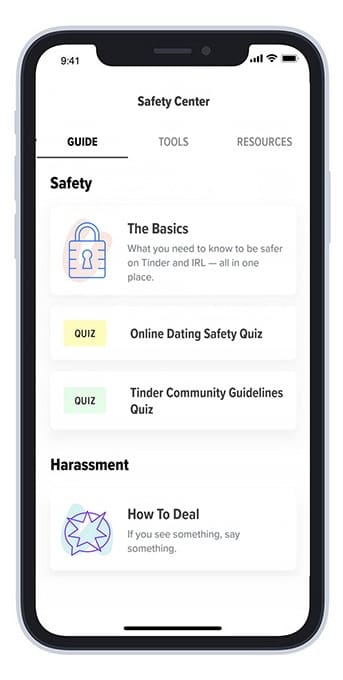 Tinder ต้องการให้สมาชิกสามารถควบคุมประสบการณ์การใช้แอพพลิเคชั่นได้มากขึ้น ศูนย์กำกับดูแลความปลอดภัยจะอยู่บนหน้าเมนูหลักบนแอพ เป็นศูนย์กลางรวบรวมข้อมูลที่เกี่ยวข้องกับความปลอดภัย รวมถึงรายชื่อองค์กรที่เชื่อถือได้และสามารถให้ความช่วยเหลือผู้ที่ต้องการความช่วยเหลือจากผู้เชี่ยวชาญที่เกี่ยวข้อง โดยสมาชิกสามารถเข้าถึงข้อมูลได้ง่ายเพียงแค่ปลายนิ้ว ไม่ว่าจะเป็นช่วงเวลาขณะที่กำลังแชทหรือหลังแชทกับคู่ Match