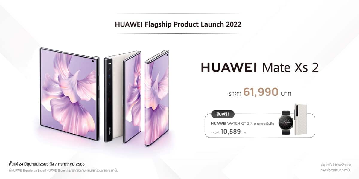 ที่สำคัญ เรื่องของราคาเมื่อเทียบกับรุ่นแรกแล้วถูกลงมาค่อนข้างเยอะเลย โดยที่รุ่นแรกนั้นราคาเปิดตัวอยู่ที่ 89,990 บาท ส่วน HUAWEI Mate Xs 2 นั้นเปิดตัวที่ 61,990 บาท ทำให้ผู้ใช้สามารถเข้าถึงสมาร์ทโฟนแบบจอพับได้ง่ายขึ้น โดยในช่วงเปิดตัว สั่งซื้อระหว่างวันที่ 24 มิถุนายน – 7 กรกฎาคม 2565 จะได้รับของแถมพิเศษ เป็น HUAWEI WATCH GT 2 Pro มูลค่า 8,990 บาท และ เคสใสสำหรับ HUAWEI Mate Xs 2 มูลค่า 1,599 บาท รวมมูลค่า 10,589 บาท