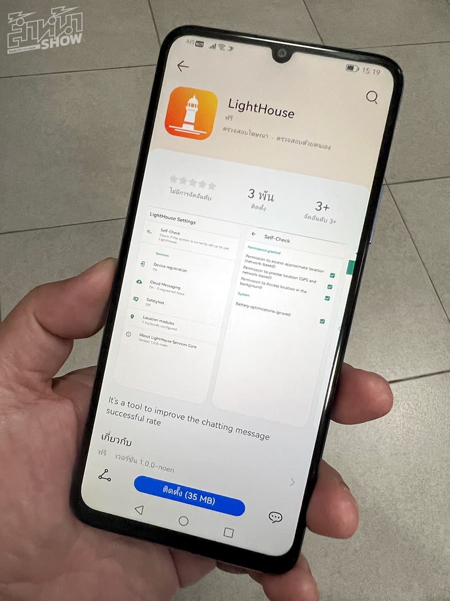 หลังจากที่อัปเดตเฟิร์มแวร์เรียบร้อย เข้าไปใน AppGallery แล้วค้นหาคำว่า “Lighthouse” เพื่อติดตั้งตัวแอปเสริมตัวนี้ (ต้องลงตัว Lighthouse EX ร่วมด้วย) จะทำงานในลักษณะของปลั๊กอินเข้าไปในระบบ เพื่อช่วยเรื่องการแจ้งเตือนและการแชร์โลเคชั่นในแอปแชตต่างๆ ได้