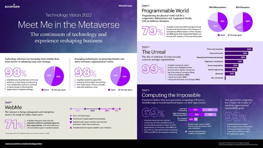 โลกเมตาเวิร์ส (WebMe: Putting the Me in Metaverse) กลยุทธ์การขับเคลื่อนองค์กรที่พัฒนาขึ้นมาบนพื้นฐานของอินเทอร์เน็ตยุคปัจจุบัน ซึ่งเป็นโลกดิจิทัลที่แพลตฟอร์มต่างๆ อาจจะไม่สามารถทำงานร่วมกันหรือโอนย้ายข้อมูลระหว่างกันได้สะดวก แต่เมตาเวิร์สและ Web3 มีความพร้อมในการกำหนดทิศทางของอินเทอร์เน็ตใหม่ โดยแทนที่จะเป็นคลังเพื่อรวมเว็บไซต์และแอปหลากหลายประเภท แต่จะมองไกลไปข้างหน้าด้วยการเป็นเมตาเวิร์สที่นำไปสู่การสร้างสภาพแวดล้อม 3 มิติต่อเนื่อง ทำให้การย้ายจาก “ที่หนึ่ง” ไปยังอีก“ที่หนึ่ง” ทำได้ง่ายเหมือนเดินออกจากห้องหนึ่งไปอีกห้องหนึ่ง และ 95% ของผู้บริหารก็เชื่อว่า แพลตฟอร์มดิจิทัลในอนาคตควรนำเสนอประสบการณ์ที่เป็นเอกภาพที่สามารถทำให้ข้อมูลของลูกค้าในแพลตฟอร์มและพื้นที่ต่างๆ ทำงานร่วมกันได้อย่างไร้รอยต่อ