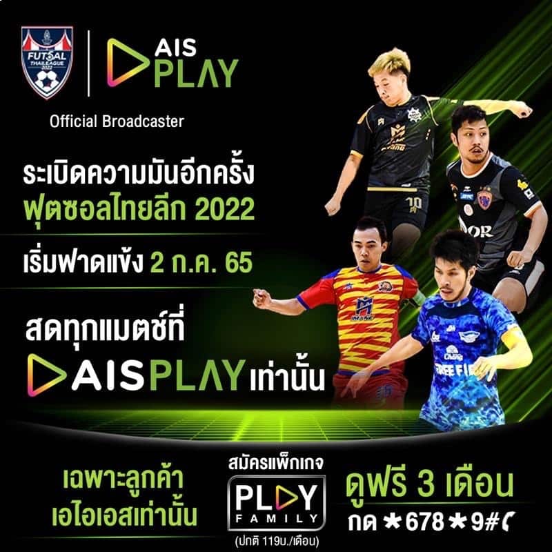 ร่วมเกาะติดศึกฟุตซอลลีกในฤดูกาลนี้ไปด้วยกัน พิเศษเฉพาะลูกค้าเอไอเอส สมัครแพ็คเกจ PLAY Family สามารถรับชมศึกฟุตซอลลีกฟรี 3 เดือนแรก โดยชมสดครบ 182 แมตช์ พร้อมไฮไลท์และรีรัน หลังจากนั้น (เดือนที่4) จ่ายเพียง 119 บาท / เดือน ทั้งนี้แพ็กเกจดังกล่าวยังสามารถรับชมคอนเทนต์บันเทิงต่างๆ ได้อีกมากมาย อย่ารอช้าเพียงสมัครกด *678*9# โทรออก อย่างไรก็ตามสำหรับลูกค้าค่ายอื่นที่ต้องการรับสิทธิ์ เพียงย้ายค่ายมาเป็นลูกค้าเอไอเอสและสมัครแพ็คเกจ https://m.ais.co.th/fbBecomeTL ก็สามารถชมฟุตซอลลีกได้เช่นกันผ่าน AIS PLAY ทุกช่องทาง ทั้งบนมือถือผ่าแอพพลิเคชัน ซึ่งสามารถดาวน์โหลดได้ทั้ง Apple App store และ Google Play Store, และสามารถรับชมผ่านทางกล่อง AIS PLAYBOX, SAMSUNG Smart TV, Apple TV