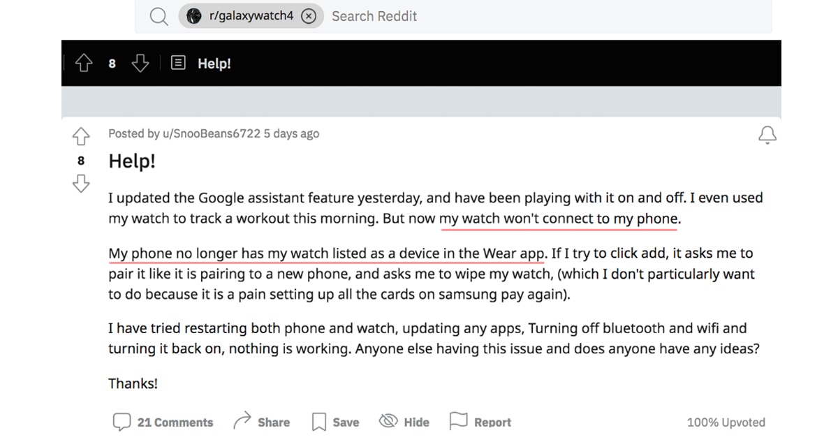 ผู้ที่ประสบอาการดังกล่าว โพสต์บน Reddit ว่า Samsung Galaxy Watch 4 ของเขาเลิกจับคู่กับสมาร์ทโฟนและทำเหมือนกับมันถูก reset โดยตั้งใจ พร้อมอธิบายว่า Galaxy Watch 4 ของเขาไม่เชื่อมต่อกับโทรศัพท์เมื่อเขาเริ่มออกกำลังกาย ปกติแล้ว หากอุปกรณ์ขาดการเชื่อมต่อระหว่างกัน ผู้ใช้สามารถตรวจสอบผ่านแอป Galaxy Wearable บนสมาร์ทโฟนที่จับคู่และทำการเชื่อมต่อใหม่จากตรงนั้นได้เลย แต่สิ่งที่เกิดขึ้นจริงคือ นาฬิกาของผู้ใช้รายนี้กลับหายไปจากแอป Galaxy Wearable และอุปกรณ์ทั้งสองไม่สามารถเชื่อมต่อกันได้อีกเลย (นาฬิกา Galaxy Watch 4 ของเขาทำงานได้ปกติ เพียงแต่ไม่สามารถจับคู่กับสมาร์ทโฟนได้)