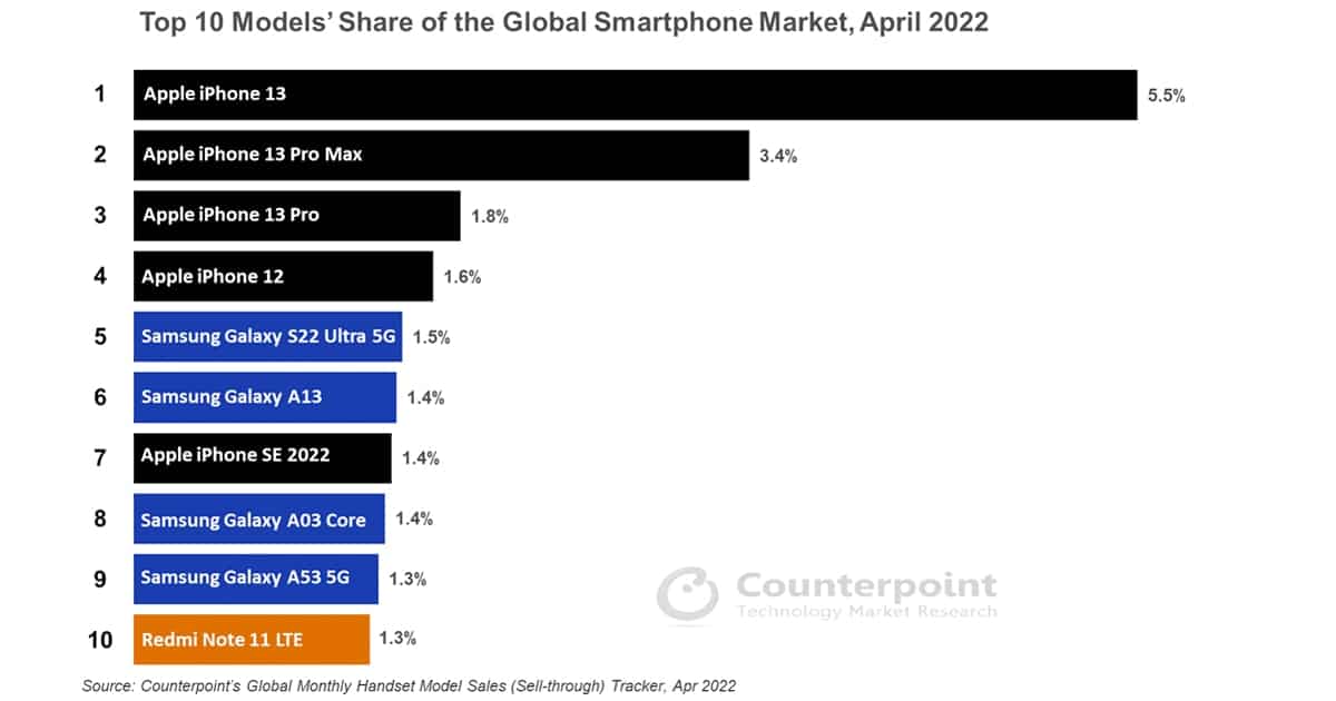 จากรายงาน Global Monthly Handset Sales Tracker ของ Counterpoint ประจำเดือนเมษายน 2022 นั้น Apple เป็นแบรนด์ที่ทำยอดขายได้ดีที่สุด ตามมาด้วย Samsung และ Xiaomi ตามลำดับ
