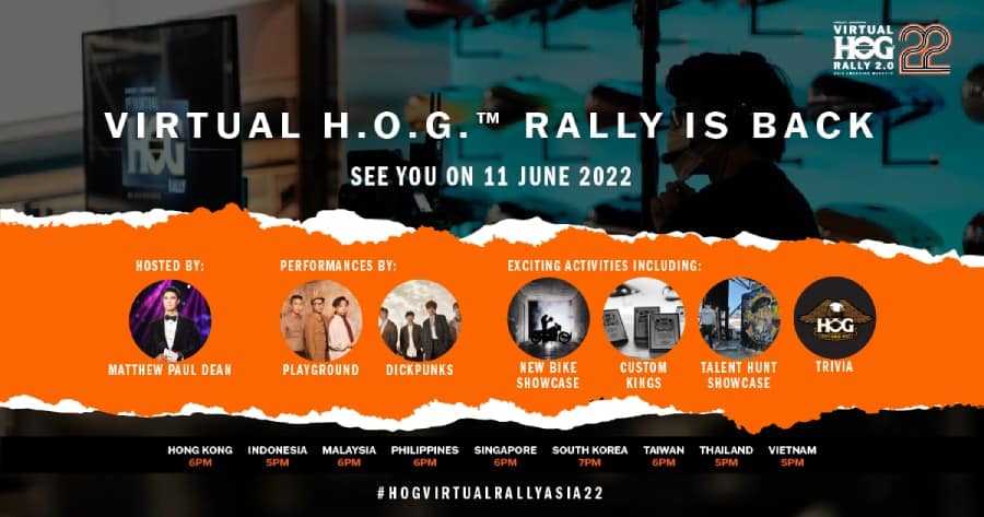 โดยงานดังกล่าวจะจัดขึ้นในรูปแบบไลฟ์สตรีมผ่านทางเพจ Facebook (@harleydavidsonasia) Instagram (@harleydavidson_asia) และ YouTube (Harley-Davidson Asia) ของ Harley-Davidson และทางเว็บไซต์ของงาน (http://www.virtualhograllyasia.com) ตั้งแต่เวลา 17.00 น. – 18.00 น. (ตามเวลาประเทศไทย)