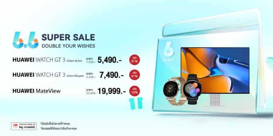 หัวเว่ย ส่งดีลเด็ดสู้ฝนกับโปร HUAWEI 6.6 Sales จัดเต็มส่วนลดสินค้าไอทีสูงสุด 40% พร้อมเสิร์ฟถึงบ้านผ่านช่องทางออนไลน์ ตั้งแต่วันที่ 1 มิถุนายน 2565 ถึง 8 มิถุนายน 2565