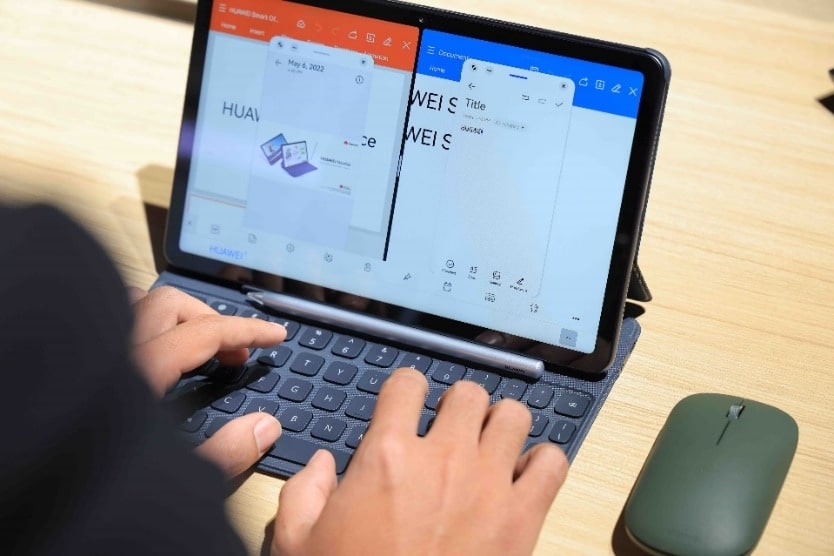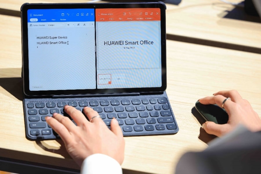 เคล็ดลับการทำพรีเซนเทชันด้วยแท็บเล็ตอย่างสะดวกที่สุดคือใช้พื้นที่หน้าจอทั้งหมดเปิดชิ้นงานแล้วใช้อุปกรณ์เสริมเป็นตัวช่วย เช่น ใช้คีย์บอร์ดพกพาในการพิมพ์เนื้อหา ใช้เมาส์บลูทูธในการคลิกแทนการใช้นิ้วสัมผัสหน้าจอ และใช้ปากกาอัจฉริยะในการวาด เขียน จดบันทึก ไฮไลท์ส่วนที่อยากเน้น รวมไปถึงลากไอเท็มต่างๆ ไปยังบริเวณที่ต้องการ ยิ่งถ้าแท็บเล็ตและอุปกรณ์เสริมทั้งหมดเป็นแบรนด์เดียวกันก็ยิ่งเชื่อมต่อกันง่ายและใช้งานได้รวดเร็วทันใจ อย่างHUAWEI MatePad 10.4-inch 2022ซึ่งสามารถใช้งานคู่กับ HUAWEI Smart Keyboard ได้ทันที โดยแผงปุ่มกดขนาด Full size พร้อมเพิ่มปุ่มคียลัดต่าง ๆ และระยะทางคีย์ขนาด 1.3 มม. นี่เองทำให้ผู้ใช้ได้ฟีลเหมือนกำลังใช้งานบนแล็ปท็อปขนาดจิ๋ว ขณะที่ HUAWEI M-Pencil Package 2nd generation ก็จับคู่ใช้งานได้เลย ส่วนเมาส์บลูทูธจากหัวเว่ย เมื่อเปิดใช้งานก็จะมีหน้าต่างปรากฏขึ้นมาบนจอแท็บเล็ตให้กดยืนยันการเชื่อมต่อ นอกจากนั้นยังสามารถดู Preview หรือหน้าต่างที่เปิดค้างไว้บริเวณด้านขวาล่างของหน้าจอ เช่น หากเราเปิดแอปฯ WPS ค้างไว้ก็สามารถกด Template ไปยังหน้าหลักที่ต้องการได้เลย เพียงเท่านี้ชีวิตก็ง่ายขึ้นอีกหลายระดับเสมือนมีแล็ปท็อปขนาดย่อมที่มีน้ำหนักเบาติดตัวแต่ใช้งานได้ครบเครื่อง