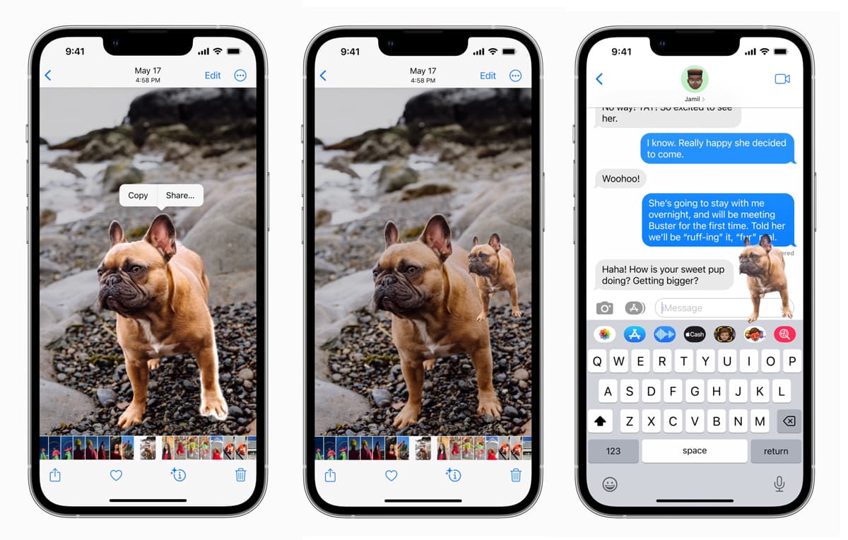 ฟีเจอร์ ใหม่ใน iOS16 ในคุณสมบัติค้นดูภาพ ผู้ใช้สามารถแตะตัวแบบในภาพค้างไว้ เพื่อตัดฉากหลังออกจากวัตถุที่ต้องการ และนำภาพไปวางในแอปอื่นๆ ได้ทันที และยังมีความสามารถเพิ่มเติมในด้านการตรวจจับนก แมลง และรูปปั้นได้อีกด้วย