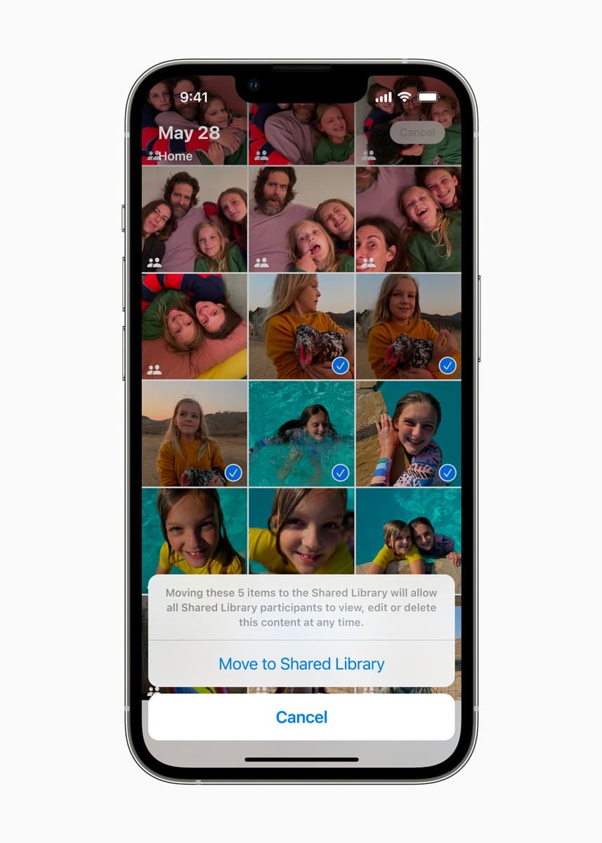 มอบช่องทางใหม่ในการแชร์รูปภาพอย่างไร้รอยต่อให้แก่ครอบครัวด้วยคลัง iCloud แยกต่างหากที่รองรับผู้ใช้สูงสุดถึง 6 คน โดยสามารถใช้งาน มีส่วนร่วม และเพลิดเพลินไปด้วยกัน ผู้ใช้สามารถเลือกแชร์รูปภาพที่มีอยู่ในคลังรูปภาพส่วนตัว หรือจะแชร์โดยพิจารณาจากวันที่เริ่มต้นหรือผู้คนในรูปภาพก็ยังได้