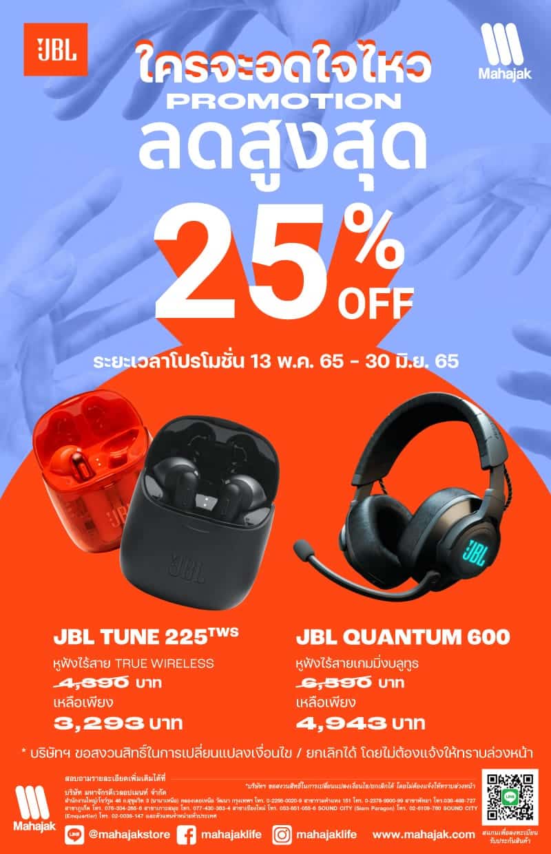 มหาจักรฯ จัดโปรโมชั่น หูฟังไร้สายราคาพิเศษเฉพาะ JBL Quantum 600 และ JBL Tune 225 TWS ลดพิเศษ 25% ระหว่างวันที่ 13 พฤษภาคม 2565 – 30 มิถุนายน 2565 นี้เท่านั้น