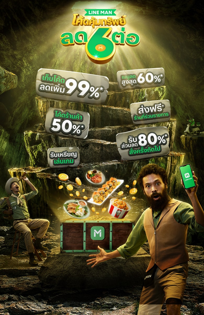 LINE MAN เดินหน้าส่งแคมเปญ “โค้ดคุ้มทรัพย์ ลด 6 ต่อ” อัดโปรแรงสุดในวงการ ให้ส่วนลดแบบจัดเต็ม ทั้งร้านอาหาร และ LINE MAN MART หวังกระตุ้นตลาดเดลิเวอรีในประเทศไทยให้คึกคัก หนุนความต้องการผู้บริโภค เพื่อเพิ่มประสบการณ์การใชังานแพลตฟอร์มเดลิเวอรีช่วยจุดประกายความสุขให้กับผู้คนในทุกมื้ออาหาร ตอกย้ำการเป็น Food Master ตัวจริงที่รู้ใจผู้ใช้คนไทยมากที่สุด