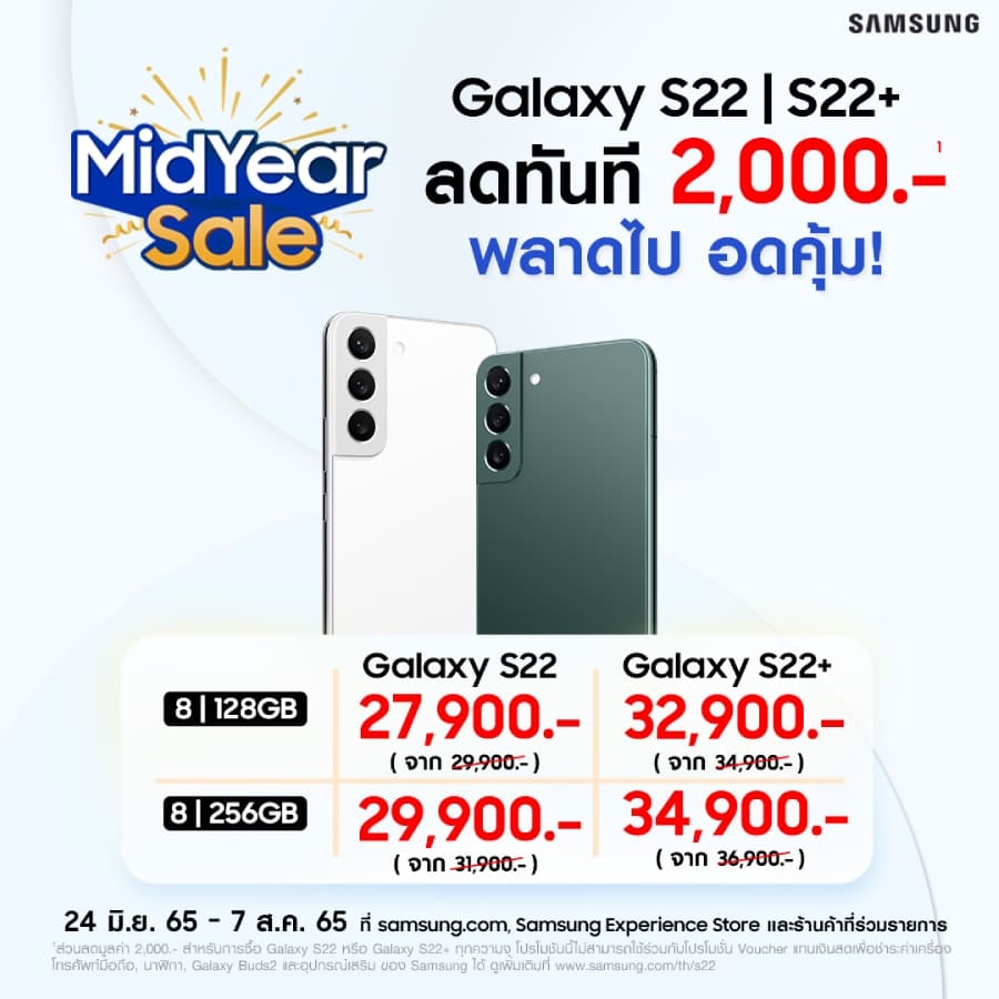 สำหรับผู้ที่สนใจ Galaxy S22 Series สามารถเป็นเจ้าของได้แล้ววันนี้ พร้อมรับส่วนลดทันที 2,000 บาท เมื่อซื้อ Galaxy S22 | S22+ ในราคาเริ่มต้นเพียง 27,900 บาท และยังสามารถนำสมาร์ทโฟนเครื่องเก่ามาแลกเพื่อรับส่วนลดเพิ่มสูงสุด 2,000 บาท หรือรับส่วนลดสูงสุดถึง 6,500 บาท เมื่อซื้อ Galaxy S22 Ultra โดยรับส่วนลด 3,500 บาท เพื่อซื้อ Galaxy Buds2 และนำสมาร์ทโฟนเครื่องเก่ารุ่นที่ร่วมรายการมาแลกรับส่วนลดเพิ่มสูงสุดอีก 3,000 บาท ตั้งแต่วันที่ 24 มิถุนายน – 7 สิงหาคม 2565 ที่ samsung.com, Samsung Experience Store และร้านค้าที่ร่วมรายการ ดูรายละเอียดเพิ่มเติมได้ที่ https://www.samsung.com/th/smartphones/galaxy-s22-ultra/special-offer/
