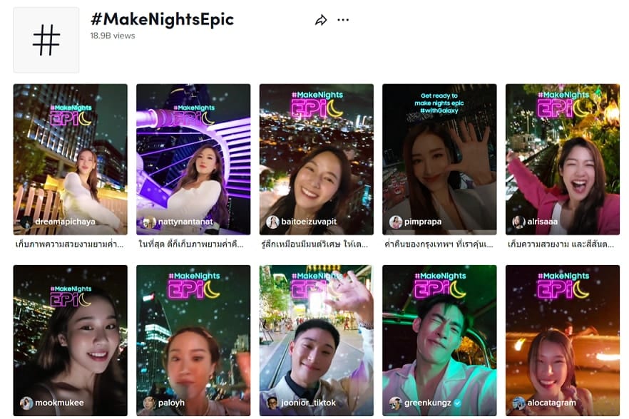 ทั้งนี้ เพราะเมืองไทยไม่แพ้ชาติใดในโลก ซัมซุงจึงอยากชวนทุกคนมาร่วมโชว์สีสันยามค่ำคืนของกรุงเทพฯ ในมุมมองของตัวเองไปด้วยกัน ด้วยวิถีง่ายๆ เพียงถ่ายภาพหรือวิดีโอพร้อมโพสต์ลงโซเชียลมีเดีย ติดแฮชแทก #MakeNightsEpic #withGalaxy และเพิ่มความสนุกให้ค่ำคืนไปอีกขั้นกับ TikTok Challenge โดยสามารถถ่ายวิดีโอด้วยฟิลเตอร์ #MakeNightsEpic ที่มาพร้อมเอฟเฟกต์สวยๆ สร้างสีสันให้การถ่ายวิดีโอสั้นลง TikTok ด้วย Galaxy S22 Ultra สามารถร่วมสนุกได้ตั้งแต่วันนี้ที่ https://smsng.store/S22TikTokChallenge