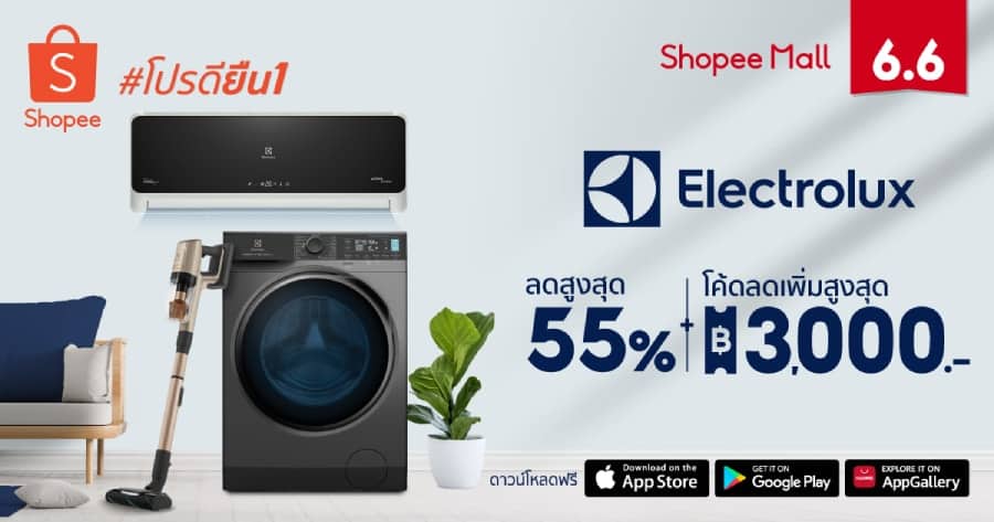 พบกับนวัตกรรมล้ำสมัยของเครื่องใช้ไฟฟ้าจากอีเลคโทรลักซ์ ที่มาพร้อมกับโปรโดนๆ ให้ช้อปอย่างจุใจในมหกรรม “Shopee 6.6 Greatest Brands Celebration” พร้อมกับสิทธิประโยชน์อีกมากมายเมื่อชำระเงินผ่าน ShopeePay และยังสามารถกดติดตาม Electrolux Official Store บน Shopee Mall ร้านค้าอย่างเป็นทางการบน Shopee Mall เพื่อรับข่าวสารและโปรโมชั่นล่าสุดตลอดปี ได้ที่ https://shopee.co.th/electrolux_officialshop
