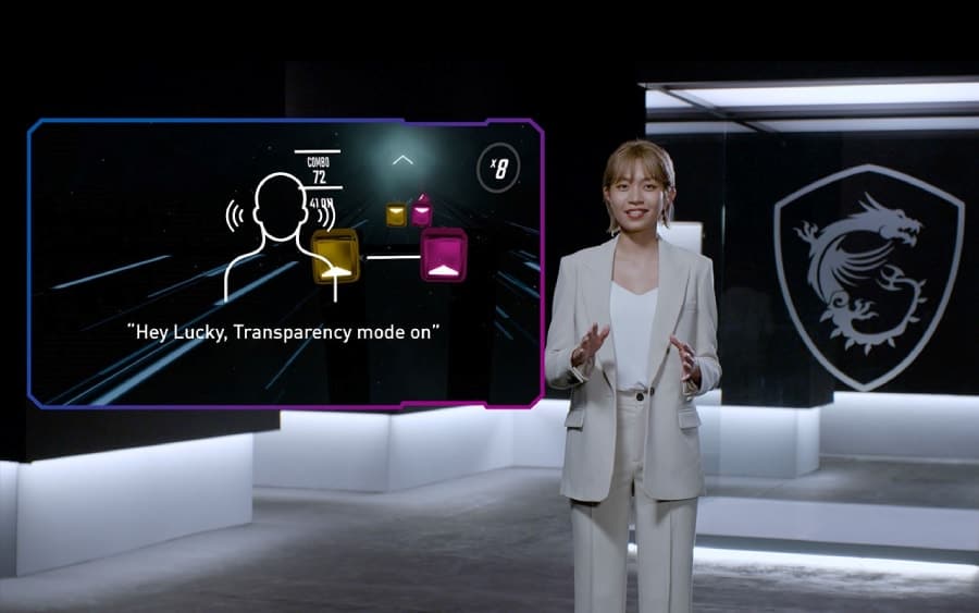 นอกจากนี้ MSI ยังได้ตั้งใจที่พัฒนาประสบการณ์การใช้งานโลกเสมือนผ่านเทคโนโลยีการสั่งการด้วยเสียง ซึ่งในอนาคตอันใกล้นี้ ผู้ใช้งานจะสามารถใช้เทคโนโลยีนี้เพื่อประสบการณ์ภายในโลกเสมือนอันไร้รอยต่อ ไม่ว่าจะเป็นการสั่งการทั่วไป หรือการตั้งค่าที่ซับซ้อน ดังที่ Ofelia เจ้าหน้าที่ฝ่ายการตลาดอาวุโส MSI ได้นำเสนอไปแล้วในงานเปิดตัวในครั้งนี้ ภายในงานเธอได้แสดงให้เห็นถึงการใช้งานจริงของเทคโนโลยีนี้ “เฮ้ ลัคกี้! เปิดการทำงานโหมด Transparency” และทันใดนั้นชุด VR ของเธอก็ได้เปิดให้เธอได้ยินเสียงจากรอบทิศทาง “ประสบการณ์การใช้ VR จะสมจริงกว่าที่เคย” Ofelia กล่าว