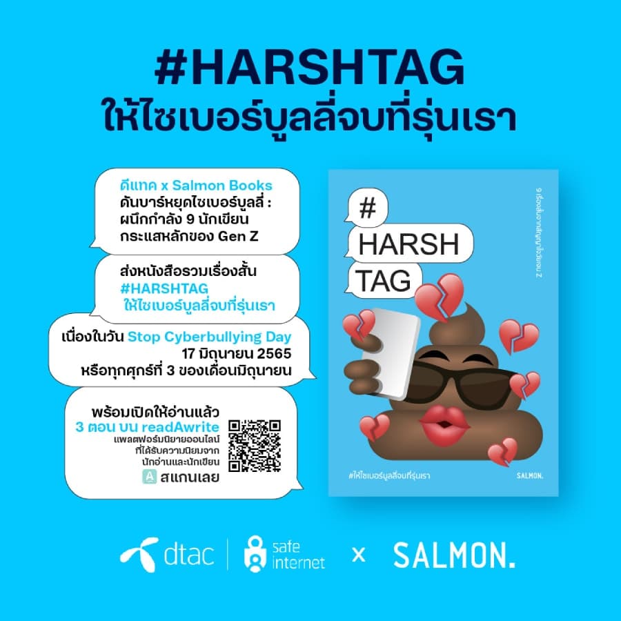 นางอรอุมา ฤกษ์พัฒนาพิพัฒน์ ผู้อำนวยการอาวุโส สายงานสื่อสารองค์กรและความยั่งยืน บริษัท โทเทิ่ล แอ็คเซ็ส คอมมูนิเคชั่น จำกัด (มหาชน) หรือดีแทค กล่าวว่า “ดีแทคให้ความสำคัญกับวันต่อต้านไซเบอร์บูลลี่สากลต่อเนื่องมาเป็นปีที่ 7 ในปีนี้ ด้วยความตระหนักถึงหน้าที่ความรับผิดชอบในฐานะบริษัทที่ให้บริการอินเทอร์เน็ตและบริการดิจิทัล ต่อความเสี่ยงบนโลกออนไลน์ที่มีผู้ใช้งานมากกว่า 28% ในไทยเป็นเด็กและเยาวชน โครงการ dtac Safe Internet ยังคงเดินหน้าให้ความรู้สร้างภูมิคุ้มกันบนโลกออนไลน์ และเป็นภาคีสำคัญในการร่วมหาทางออกและลดความรุนแรงจากภัยออนไลน์ ซึ่งไซเบอร์บูลลี่เป็นประเด็นปัญหาในลำดับต้นๆ ที่เยาวชนไทยตระหนักถึงอันตรายและอยากเข้ามามีส่วนร่วมในการแก้ปัญหา ในปีนี้ ดีแทคได้ร่วมกับสำนักพิมพ์แซลมอน หยิบข้อเสนอของเยาวชนใน ‘สัญญาใจวัย Gen Z’ มาถ่ายทอดเป็นเรื่องสั้นที่เปิดเผยถึงค่านิยม ทัศนคติ และประสบการณ์ของคนรุ่นใหม่ และสอดแทรกด้วยแนวทางปฏิบัติที่ใช้ได้จริงทั้ง 23 ข้อ เพื่อหยุดไซเบอร์บูลลี่ ซึ่งรายได้ทั้งหมดจากการจัดจำหน่ายหนังสือ ดีแทคจะส่งต่อให้สำนักพิมพ์แซลมอน (Salmon Books) ทั้งหมดโดยไม่หักค่าใช้จ่าย”