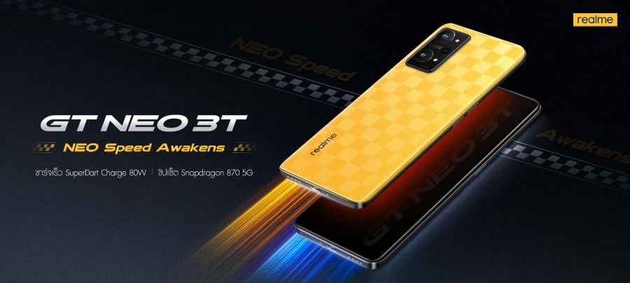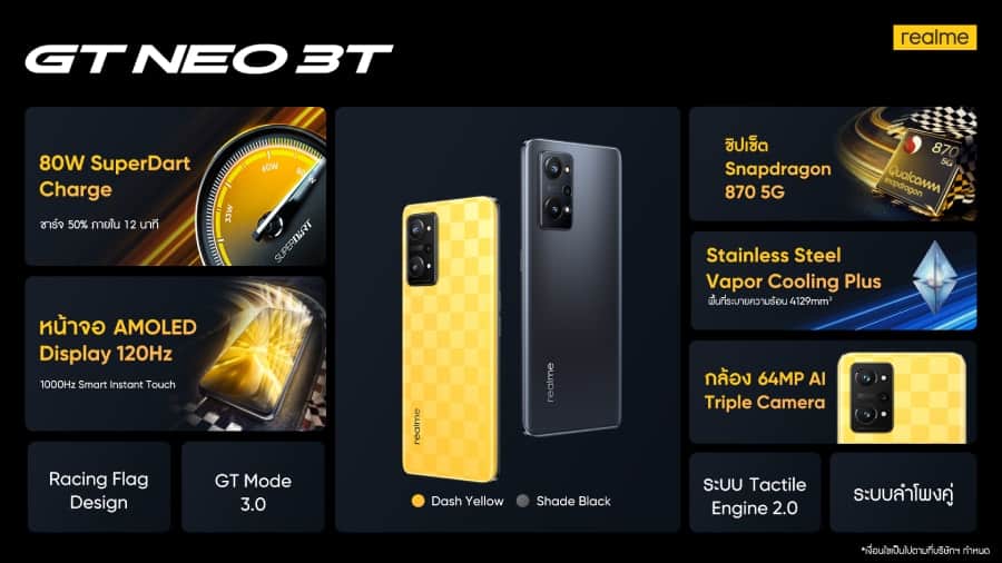 - realme GT NEO 3T มาพร้อมความจุ 8+128GB มีให้เลือก 2 สี ได้แก่ Dash Yellow และ Shade Black