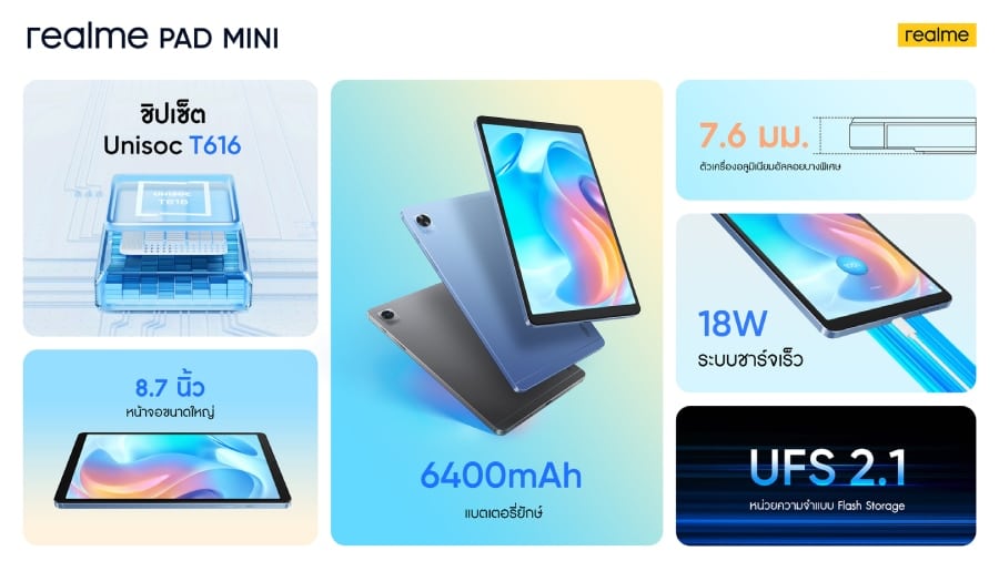 realme Pad mini มาด้วยขนาดที่บางเพียง 7.59 มม. น้ำหนัก 372 กรัม พร้อมจอแสดงผล 8.7 นิ้วความละเอียด WXGA+ (Wide Extended Graphics Array) ทำงานด้วยชิปประมวลผล Unisoc T616 แบบ 8 แกน ซึ่งทำคะแนน Antutu Benchmark ได้สูงถึง 204,454 จึงมั่นใจได้ถึงการทำงานที่ลื่นไหล ตอบสนองการใช้งานทั่วไปได้แบบไม่มีสะดุด นอกจากนี้ ยังมาพร้อมแบตเตอรี่ยักษ์ขนาด 6400mAh ให้คุณใช้งานได้ยาวนาน ดูยูทูปต่อเนื่อง 12 ชั่วโมง หรือประชุมออนไลน์ผ่าน ZOOM ต่อเนื่อง 15 ชั่วโมง และเล่นเกมได้นานถึง 8 ชั่วโมงเลยทีเดียว และยังรองรับ Quick Charge 18W ให้คุณได้เปิดประสบการณ์การใช้งานได้ไม่สะดุด