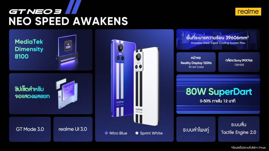 realmeแบรนด์เทคโนโลยีเพื่อคนรุ่นใหม่ที่เติบโตเร็วที่สุดในโลก เปิดตัวสมาร์ตโฟนเรือธงรุ่นใหม่ล่าสุด กับ “realme GT NEO 3 Series” จัดเต็มกับประสบการณ์ความเร็ว และแรง ในแบบ NEO Speed Awakens ทั้ง 2 รุ่น ได้แก่ realme GT NEO 3 สมาร์ตโฟนกลุ่มแรกของโลกที่ใช้หน่วยประมวลผลรุ่นใหม่ล่าสุดจากค่าย MediaTek อย่าง Dimensity 8100 มอบสุดยอดประสิทธิภาพการทำงานแบบจัดเต็ม และ realme GT NEO 3T มาพร้อมขุมพลัง Qualcomm Snapdragon 870 และเทคโนโลยี SuperDart Charge 80W ที่ตอบโจทย์การใช้งานในชีวิตประจำวันได้อย่างสมบูรณ์แบบ และเพื่อเติมเต็มชีวิตยุคดิจิทัล realme นำเสนอสองแก็ดเจ็ตน้องใหม่ทั้ง realme Pad mini แท็บเล็ตขนาด 8.7 นิ้วที่ให้คุณใช้งานได้อย่างคล่องตัว และ realme Buds Air 3 หูฟังบลูทูธที่มอบคุณภาพเสียงระดับไฮเอนด์กับ มาพร้อมสีใหม่ล่าสุดอย่าง ‘Nitro Blue’