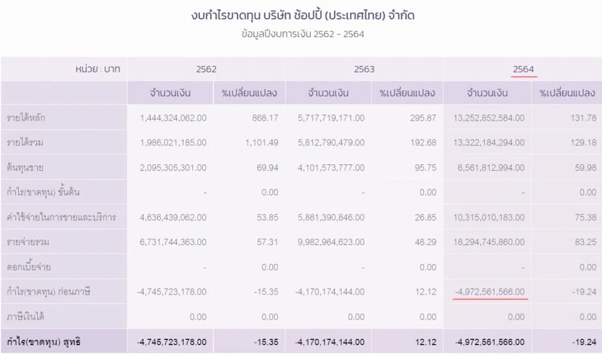จากการตรวจสอบข้อมูลผลการดำเนินการของ Shopee (ประเทศไทย) จากกรมพัฒนาธุรกิจการค้าปี 2021 ถึงแม้บริษัทมีรายได้ 13.3 หมื่นล้านบาท แต่ผลประกอบการก็ยังขาดทุนที่ 4.97 พันล้านบาท เป็นผลขาดทุนเพิ่มขึ้น 19.24% เมื่อเทียบกับปี 2020 ที่มีผลขาดทุนที่ 4.17 พันล้านบาท