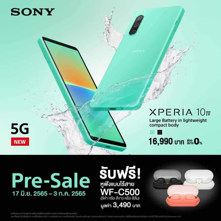 Xperia 10 IV พร้อมเปิดให้ผู้สนใจได้สั่งจองล่วงหน้าตั้งแต่วันที่ 17 มิถุนายน ถึง 3 กรกฎาคม ศกนี้ โดยมีให้เลือก 2 สีคือสีดำ และสีเขียวมิ้นท์ ในราคา 16,990 บาท พร้อมรับของสมนาคุณเป็นหูฟังตัดเสียงรบกวนไร้สายรุ่น WF-C500 มูลค่า 3,490 บาท ได้ที่โชว์รูมโซนี่ สโตร์ทุกสาขา ได้แก่ สาขาไอคอนสยาม เซ็นทรัลพระรามเก้า สยามพารากอน เอ็มควอเทียร์ เดอะมอลล์บางแค และเดอะมอลล์บางกะปิ ร้านโซนี่เซ็นเตอร์โดยบูรพวัฒน์ รวมถึงช่องทางออนไลน์ของโซนี่สโตร์ ผู้สนใจสามารถติดต่อสอบถามข้อมูลเพิ่มเติมได้ที่ ศูนย์ข้อมูลโซนี่ โทร. 0-2715-6100 หรือเยี่ยมชมเว็บไซต์ www.sony.co.th