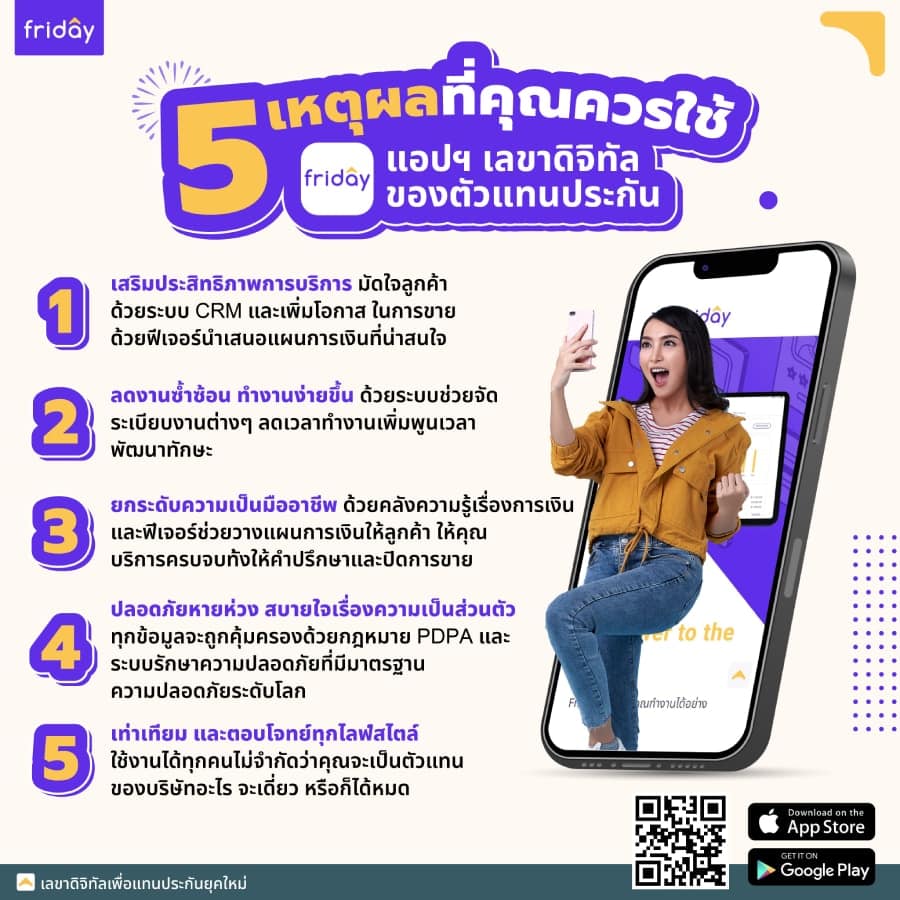 สำหรับตัวแทนประกันและที่ปรึกษาการเงินที่สนใจแอปพลิเคชัน ‘Friday’ สุดยอดเลขามือหนึ่งที่จะมาช่วยให้ทำงานได้อย่างเป็นมืออาชีพ เสริมประสิทธิภาพในการบริหารงานขายได้ดียิ่งขึ้น ช่วยให้การทำงานง่ายและสะดวกสบายมากกว่าเดิม สามารถลงทะเบียนเพื่อเปิดบัญชีผู้ใช้งานได้ที่ www.friday.in.th และดาวน์โหลดแอปพลิเคชัน Friday ได้แล้ววันนี้ ทั้งบนระบบ iOS และ Android ทาง App Store และ Google Play Store