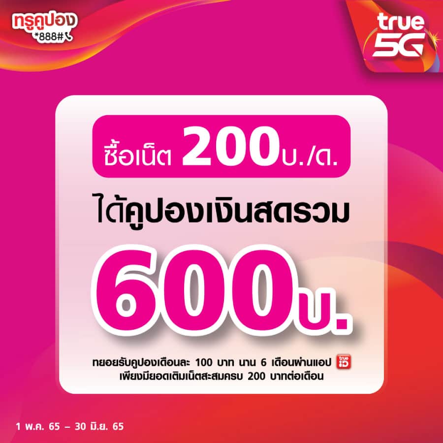 - ซื้อแพ็กเกจอินเทอร์เน็ตครั้งแรก 200 บาท ขึ้นไป รับคูปองเงินสดรวม 600 บาท (รับคูปองเดือนละ 100 บาท นาน 6 เดือน ผ่านแอปทรูไอดี เพียงมียอดเติมแพ็กเน็ตสะสมครบ 200 บาท/เดือน ทุกๆ เดือน นานต่อเนื่อง 6 เดือน)