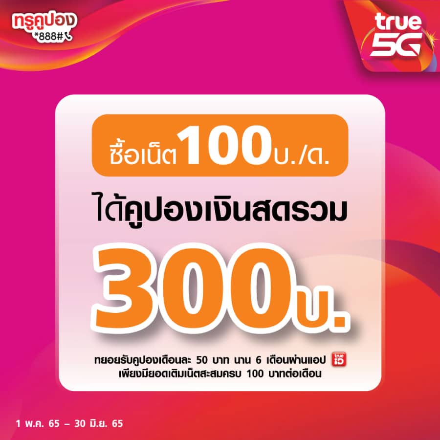 - ซื้อแพ็กเกจอินเทอร์เน็ตครั้งแรก 100 – 199 บาท รับคูปองเงินสดรวม 300 บาท (รับคูปองเดือนละ 50 บาท นาน 6 เดือน ผ่านแอปทรูไอดี เพียงมียอดเติมแพ็กเน็ตสะสมครบ 100 บาท/เดือน ทุกๆ เดือน นานต่อเนื่อง 6 เดือน)