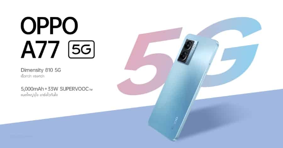 OPPO A77 5G ตัวเลือกที่ดีที่สุดของสมาร์ทโฟน 5G วางขายอย่างเป็นทางการแล้ววันนี้ อัดแน่นด้วยฟีเจอร์แบบจัดเต็มตอบโจทย์ชีวิตอันเร่งรีบเน้นความเร็วทันใจในการใช้งาน เล่นเกม เล่นโซเชียล ดูหนัง ฟังเพลง สุดคุ้มครบจบในเครื่องเดียวด้วยชิปเซ็ต MediaTek Dimensity 810 5G ล่าสุดที่เร่งประสิทธิภาพของ CPU สูงขึ้นทำให้สามารถใช้งานหรือเล่นเกมได้อย่างลื่นไหล รวดเร็ว แรงทันใจ พร้อมหน่วยความจำ RAM 6GB และ ROM 128GB และ RAM Expansion ที่สามารถเพิ่มถึง 5GB ทำให้เปิดหลายแอปฯ พร้อมกันได้แบบไม่สะดุด และแบตเตอรี่ใหญ่จุใจขนาด 5,000mAh