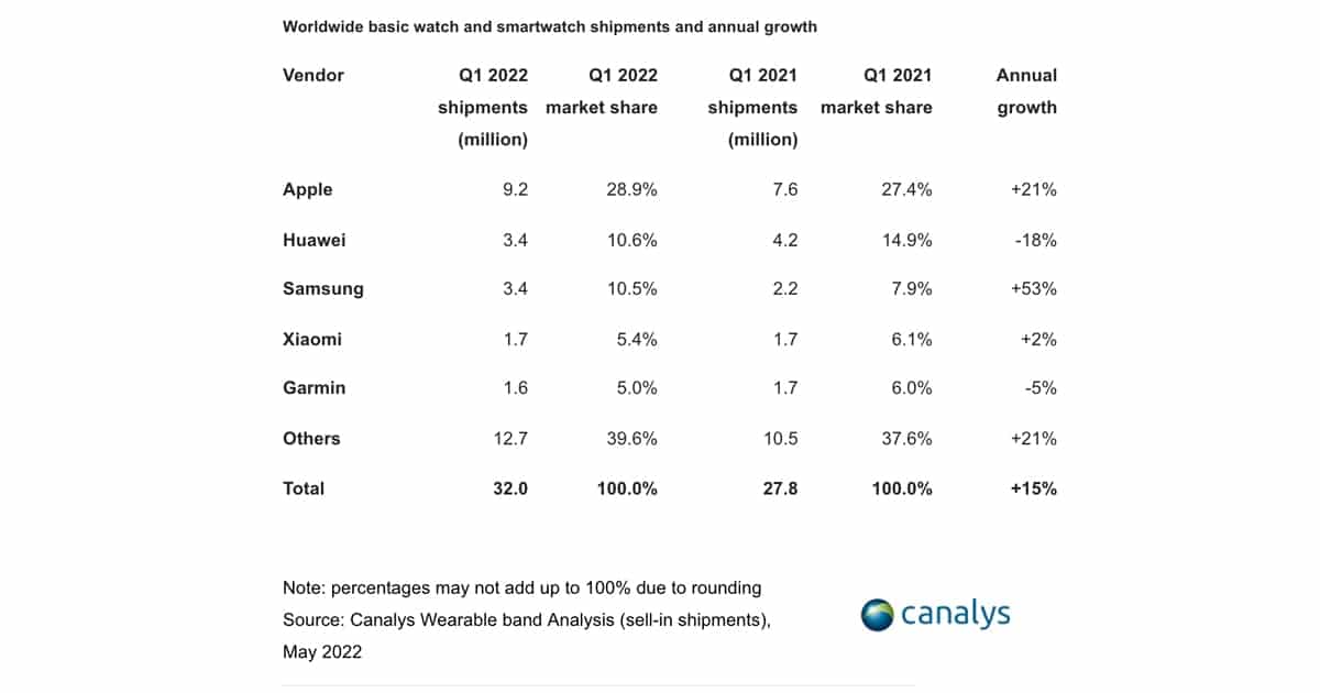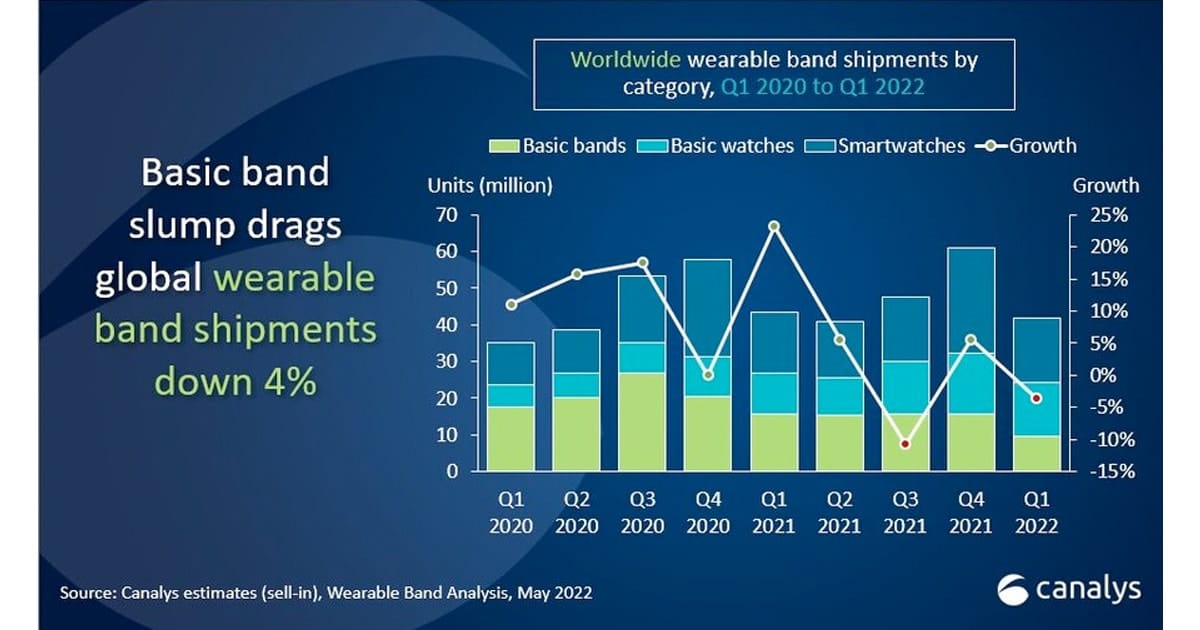 จากรายงานของ Canalys ระบุว่าการจัดส่งอุปกรณ์ wearable ในไตรมาสที่ 1 ปี 2022 ลดลง 4% มาอยู่ที่ 41.7 ล้านหน่วย แต่ทว่าทางฝั่งของสมาร์ทวอชนั้นยังคงเพิ่มขึ้นอย่างต่อเนื่อง โด มีอัตราการเติบโตขึ้น 15% อยู่ที่ 32.0 ล้านเรือน