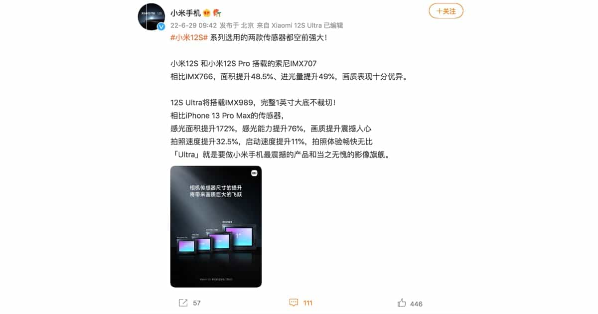 Xiaomi ยืนยันแน่นอนแล้วว่าพร้อมเปิดตัวสมาร์ทโฟน Xiaomi 12S ซีรีส์ที่ประเทศจีนวันที่ 4 กรกฎาคม 2022 นี้ หลังจากได้แง้มๆ ฟีเจอร์ของโทรศัพท์ โดยเปิดเผยดีไซน์ของรุ่น Pro ให้เห็นไปเมื่อวันก่อน ล่าสุดได้เผยสเปคกล้องหลักของสมาร์ทโฟนใหม่ในซีรีส์ 12S ทั้ง 3 รุ่น โดย Xiaomi 12S Ultra จะใช้เซ็นเซอร์ Sony IMX989 เป็นรุ่นแรก มีจุดเด่นคือขนาดของเซ็นเซอร์ใหญ่ถึง 1 นิ้ว ที่เป็นระดับเดียวกับกล้องดิจิตอลคอมแพ็คเลยทีเดียว