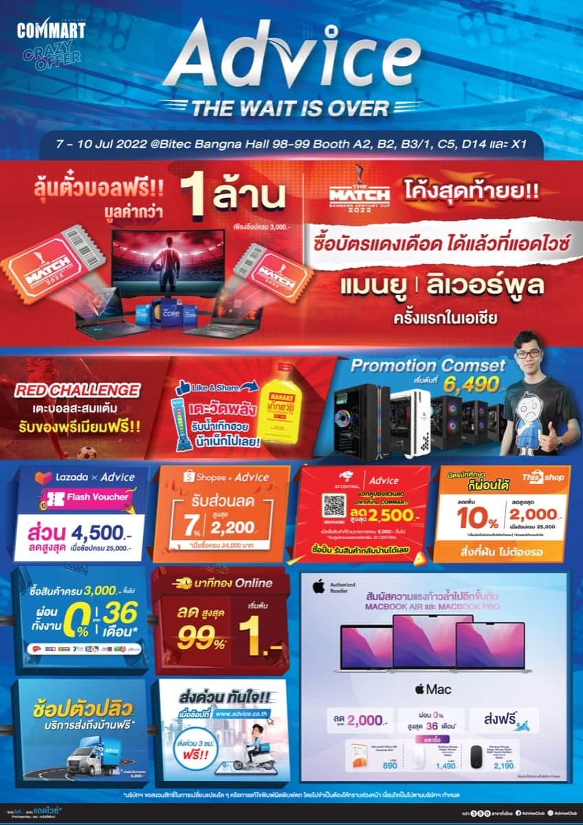 - ลุ้นรับบัตรเข้าชมการแข่งกันฟุตบอล “THE MATCH” เมื่อช้อปสินค้าครบทุก 3,000 บาทรับ 1 สิทธิ์ร่วมลุ้น เฉพาะลูกค้าที่ซื้อสินค้าบูธ Advice ในงานคอมมาร์ทและช่องทางออนไลน์ IT Expo (สามารถเลือกซื้อสินค้าได้ภายในเวลา 00:01 น. วันพฤหัสบดีที่ 7 กรกฎาคม 2565) ยิ่งช้อปมากยิ่งมีสิทธิ์ลุ้น