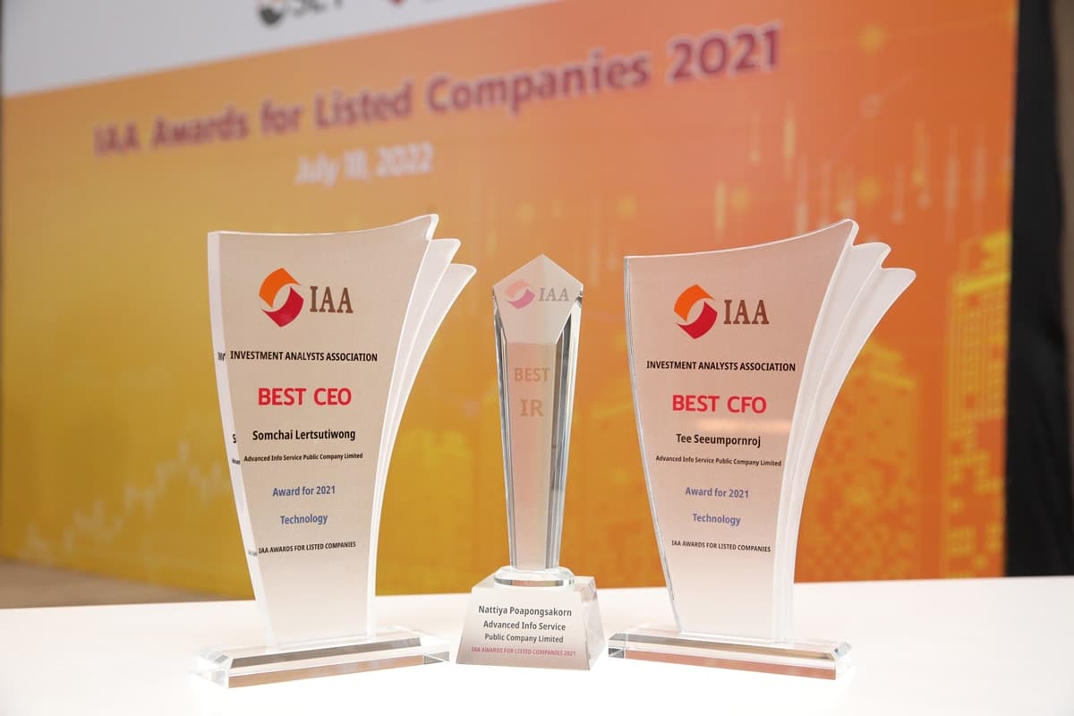 เป็นอีกครั้งที่ AIS คว้า 3 รางวัลต่อเนื่องเป็นปีที่ 2 กับองค์กรที่ได้รับความเชื่อมั่นจากลูกค้าและนักลงทุนในไทยในการประกาศผล IAA Awards for Listed Companies 2021 โดยสมาคมนักวิเคราะห์การลงทุน ประกอบไปด้วย รางวัล CEO ยอดเยี่ยม, รางวัล CFO ยอดเยี่ยม และ รับรางวัล IR ยอดเยี่ยม ในกลุ่มเทคโนโลยี ถือเป็นโอเปอร์เรเตอร์เพียงรายเดียวที่ได้รับรางวัลในปีนี้ มากไปกว่านั้นยังเป็นองค์กรไทยรายเดียวที่คว้าทั้ง 3 รางวัลได้เป็นปีที่ 2 ติดต่อกัน สำหรับรางวัลนี้เป็นการพิจารณาที่ตัดสินด้วยการลงคะแนนของเหล่านักวิเคราะห์การลงทุนในประเทศไทย สะท้อนผลการทำงานที่แข็งแกร่งของ เอไอเอส อย่างรอบด้าน อีกทั้งยังเป็นการดำเนินธุรกิจที่คำนึงถึงผู้มีส่วนได้ส่วนเสียทุกกลุ่ม เพื่อสร้างคุณค่าให้เกิดการเติบโตอย่างยั่งยืนทั้งในด้านเศรษฐกิจ สังคม และสิ่งแวดล้อมไปพร้อมๆ กัน ภายใต้หลักธรรมมาภิบาล